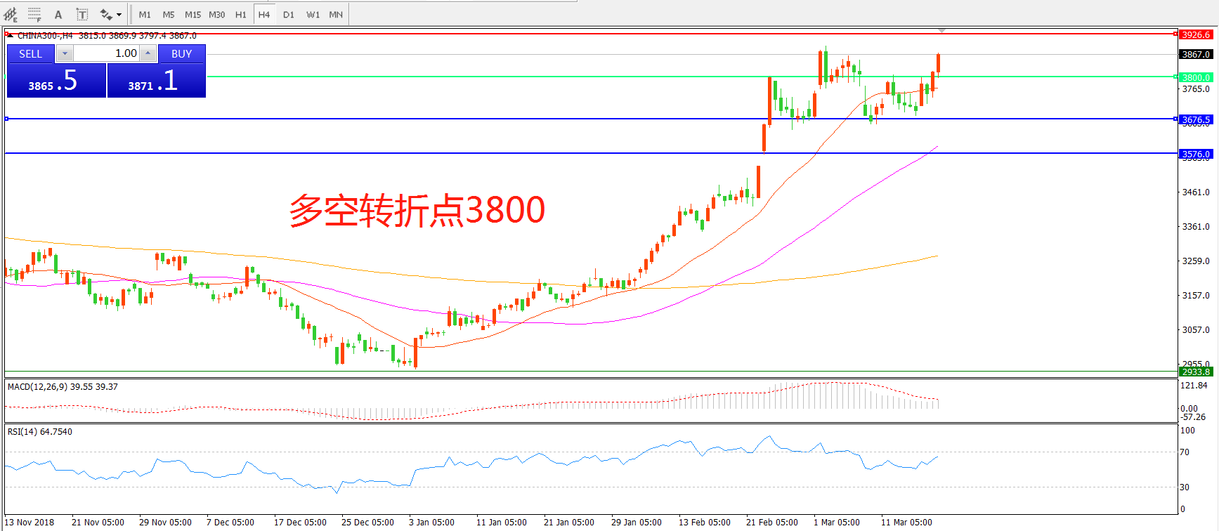 4小时图看,中华指数CHINA300中华指数连续上行,整体形态偏多,均线系统呈多头排列, MACD红柱增加,RSI指标向上,日内延续上行概率较大。
