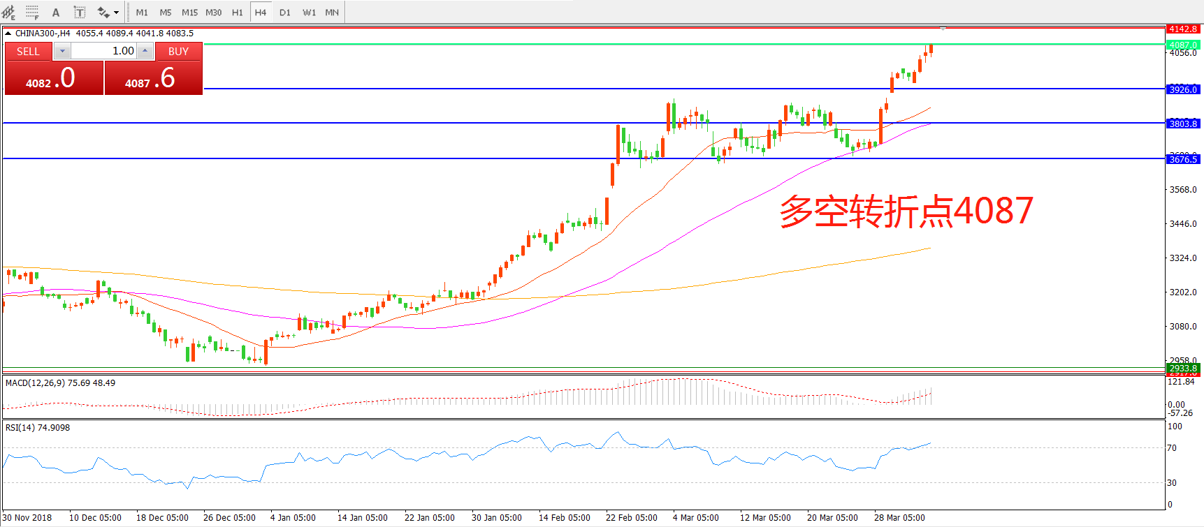 4小时图看,中华指数CHINA300以55均线为依托,连续上行,整体走势偏强。 MACD红柱增加,RSI指标拐头,多头趋势依然明显,开盘后延续上升概率较大。