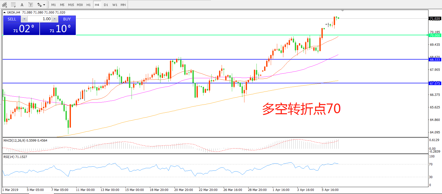 周一(4月8日),美国总统特朗普宣布将伊朗伊斯兰革命卫队列为恐怖组织,加剧了中东的紧张局势, 另一方面利比亚局势再度紧张,大约100万桶/日的产量中有40%恐受到影响,这令OPEC原油供应面临进一步下滑的风险。油价周一盘中延续涨势。布伦特原油价格盘中最高触及71.16美元/桶,最终收报71.03美元/桶.