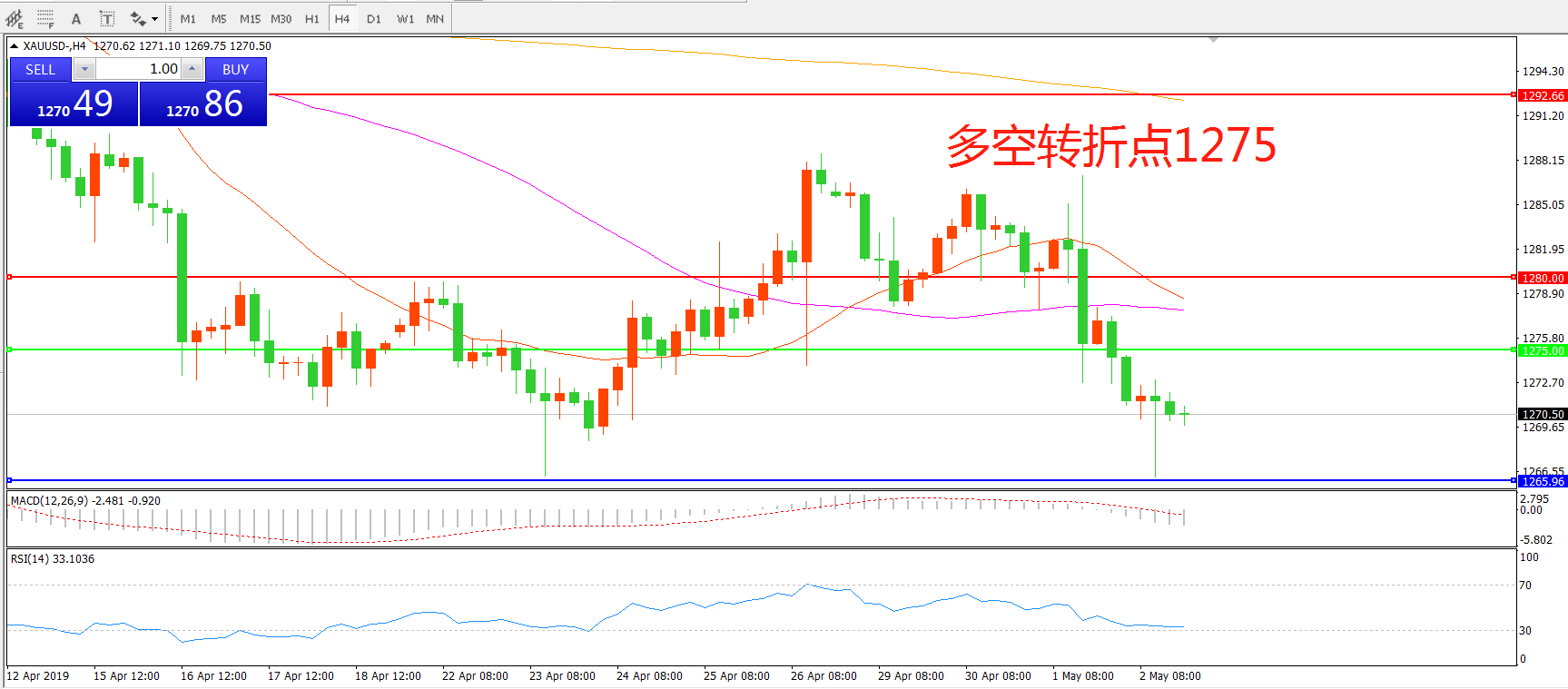 周四(5月2日),美国最新出炉的初请和工厂订单等数据表现良莠不齐,但美元指数依然延续涨势,日内最高触及97.86高位。美联储主席鲍威尔隔夜的言论打压了市场的降息预期,使得美元多头备受鼓舞。在市场消化美联储最新信号、等待非农数据之际,现货黄金则跌至今年以来的最低水平,收报1270美元/盎司,今晚20:30分将公布非农就业人口数据,重点关注。