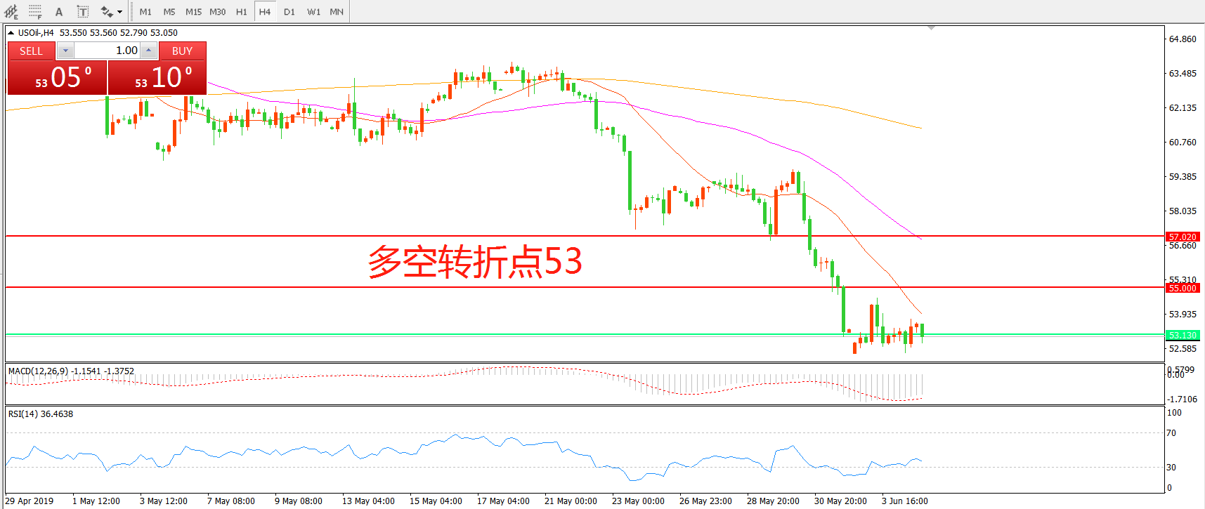 6月4日周二开始,美联储将在芝加哥举行为期两天的《美联储在倾听:货币政策策略、工具和沟通实践会议》系列会议。美联储主席鲍威尔今日致辞时表示,美联储将采取恰当措施维持经济持续扩张,正在密切关注贸易谈判和其他事件对美国经济前景的影响,这一语句也最被市场看重,此番言论被解读为暗示降息的可能性。市场风险情绪受到提振,但随后美国石油学会(API)原油库存意外增加355万桶,同时库欣及精炼油库存也大增,数据公布后,美油基本抹去此前涨幅,最终收跌0.1美元,报52.96美元/桶,晚间22:30将公布EIA库存数据,重点关注。