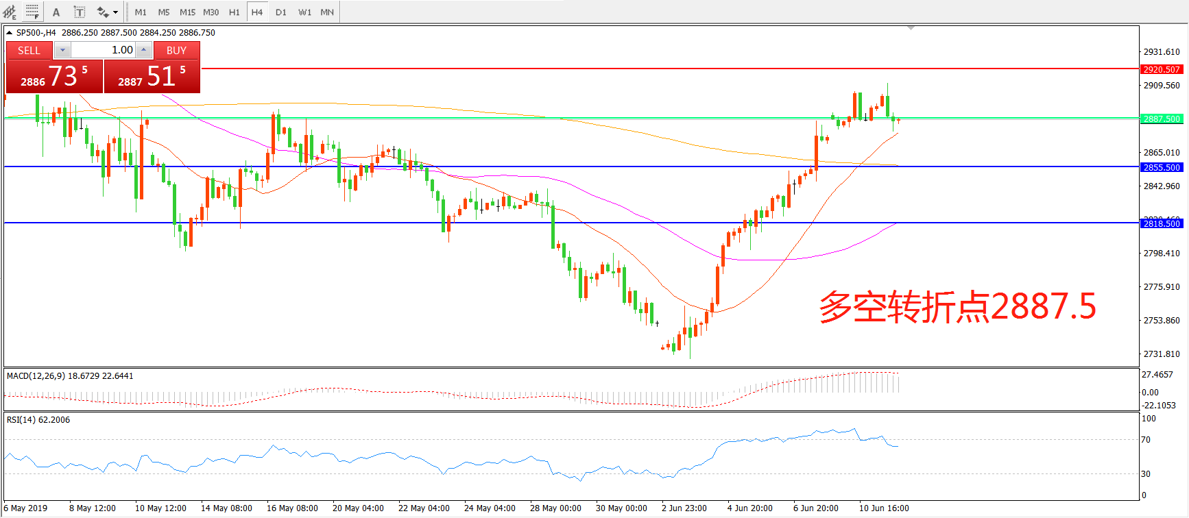 4小时图看,标普连续两日冲高回落,显示上方阻力较强, 2887.5成为短期争夺焦点,短期均线走平,MACD红柱减少,RSI指标走平,日内延续高位震荡思路概率较大。