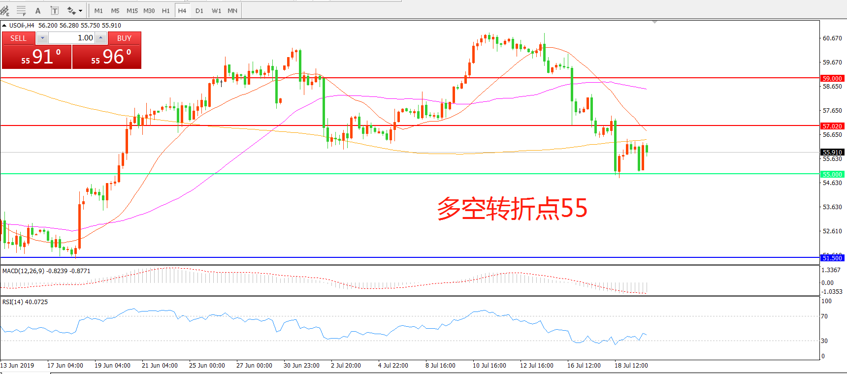 4小时图看,油价长阴破位后以55美元为依托展开震荡,200周期均线形成上方阻力, MACD绿柱缩短, RSI指标拐头走平,日内延续震荡概率较大,55美金是油价较强支撑,连续下行的预计会在此展开整理。