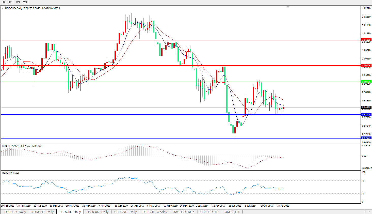 美元兑瑞郎在周一欧洲时段盘中跌至0.9804的低位,为自7月1日以来的三周新低。原因在于,中东地缘局势在周末再度恶化重新激起了瑞郎的避险买需,同时,美联储重新强化的宽松前景也令美元面临压力;此前,伊朗在周末扣押英国船只事件,令投资者对中东石油运输通道的畅通再度生疑,地缘局势疑云也带动避险情绪升温,令避险货币得利。相比起日语汇率上涨空间还受到其国内选举结果影响的局面,瑞郎的上涨过程中就更加肆无忌惮;但这也意味着压力会更多地来到瑞士央行这一边。本周欧洲央行将发布利率决议,下周美联储也将跟进,全球货币宽松竞赛似乎已经鸣响发令枪,这令已经缺少“弹药”,早已维持着高水平负利率的瑞士央行感到更加难堪。一旦美欧同行行动,难保瑞士方面不会故伎重演,通过强行入市干越的方式来调控汇率水平.