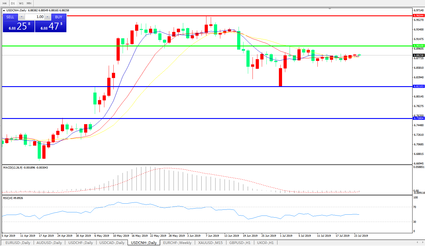 交易策略: 在6.9010之下,看跌,目标价位为6.8210,然后为6.7580。