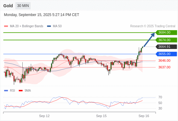 在 3655.00 之上,看涨,目标价位为 3674.00 ,然后为 3684.00 。