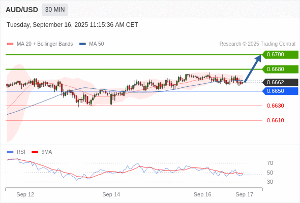 在 0.6650 之上,看涨,目标价位为 0.6680 ,然后为 0.6700 。