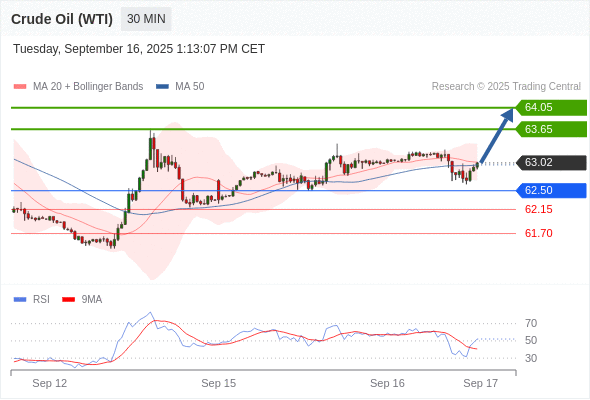 在 62.50 之上,看涨,目标价位为 63.65 ,然后为 64.05 。
