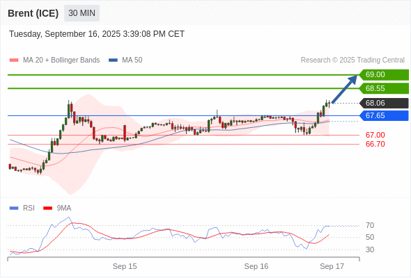 在 67.65 之上,看涨,目标价位为 68.55 ,然后为 69.00 。