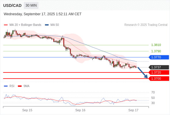 美元/加元 当日内: 期待1.3700。