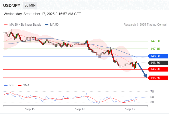在 146.80 之下,看跌,目标价位为 146.20 ,然后为 145.80 。