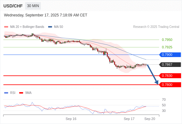 在 0.7900 之下,看跌,目标价位为 0.7830 ,然后为 0.7800 。