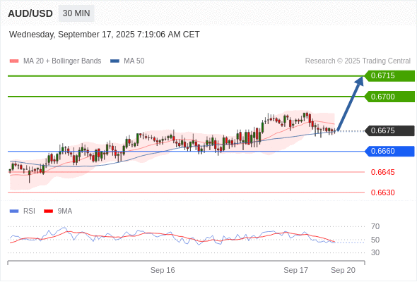 在 0.6660 之上,看涨,目标价位为 0.6700 ,然后为 0.6715 。