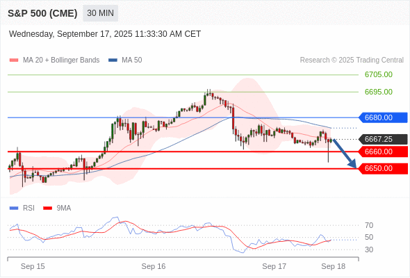 在 6680.00 之下,看跌,目标价位为 6660.00 ,然后为 6650.00 。