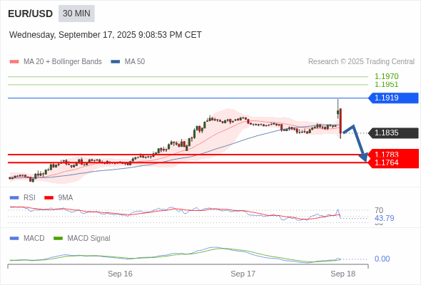 欧元/美元 当日内 : 当 1.1919 维持阻力位时,存在回归 1.1764 的风险。