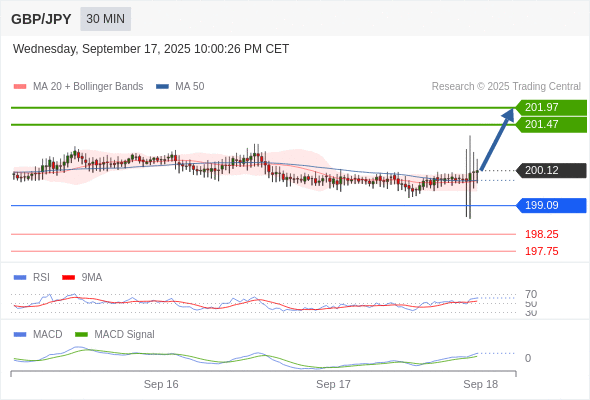 备选策略: 如跌破 199.09 ,GBP/JPY 目标方向定在 198.25 和 197.75 。