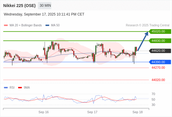 日经225股指期货 (OSE) 当日内: 超短线(当日内)支撑位在44390.00附近。