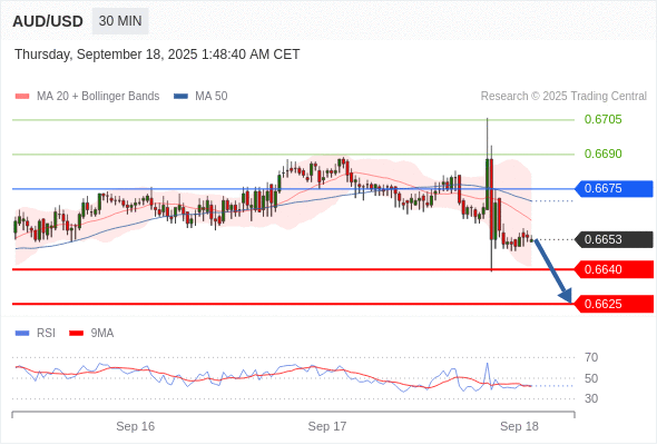 在 0.6675 之下,看跌,目标价位为 0.6640 ,然后为 0.6625 。