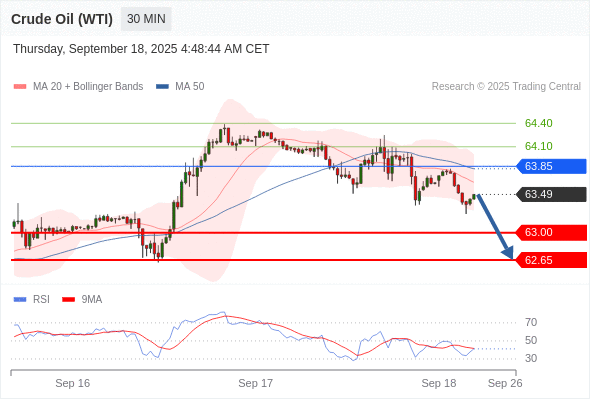 交易策略: 在 63.85 之下,看跌,目标价位为 63.00 ,然后为 62.65 。