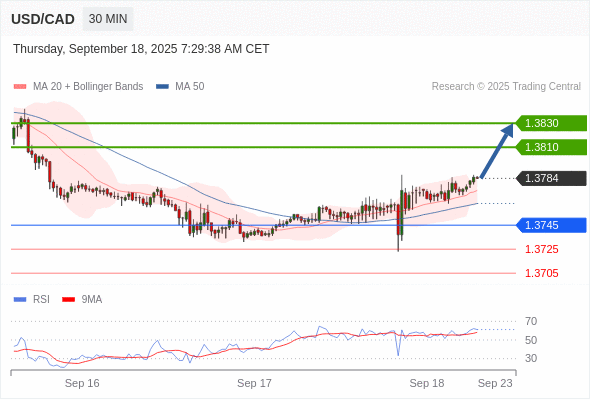 在 1.3745 之上,看涨,目标价位为 1.3810 ,然后为 1.3830 。