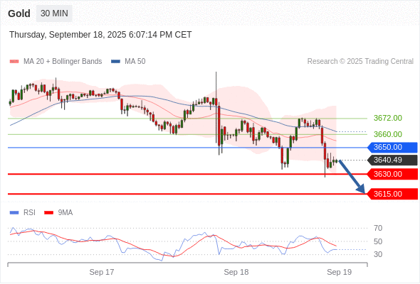 在 3650.00 之下,看跌,目标价位为 3630.00 ,然后为 3615.00 。