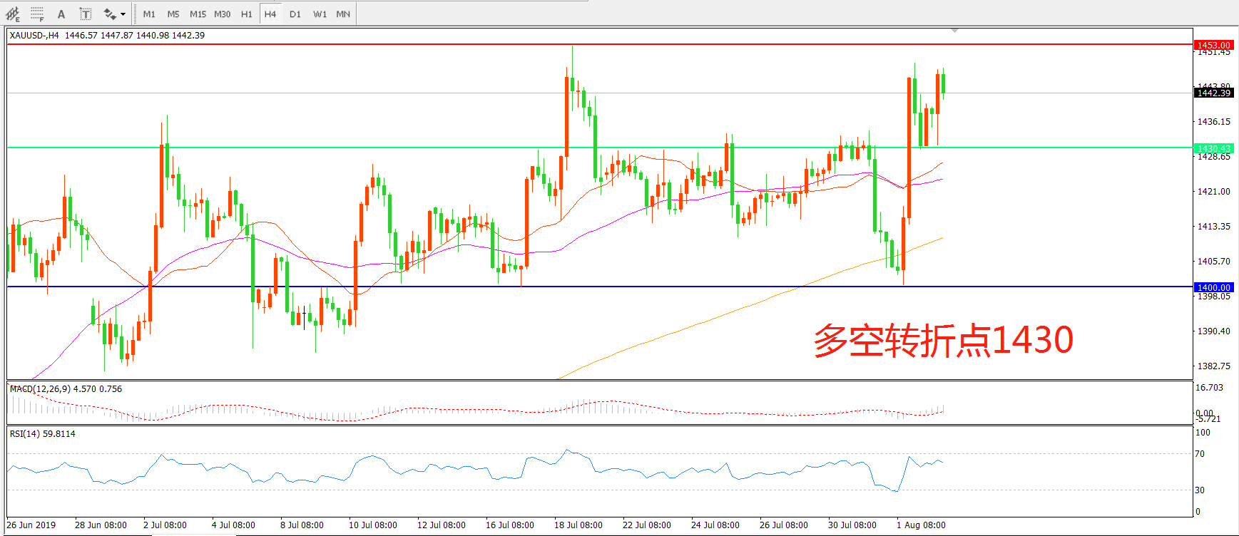 过去一周,全球金融市场可谓惊心动魄,美联储决议先声夺人,结果如市场预期降息25个基点,但会后声明措辞以及美联储主席的的鹰派发言让整个市场掀起惊涛骇浪,金价回落后再度冲高。随后特朗普扬言要对中国价值3000亿美元的商品加征关税后,市场避险情绪高涨,黄金一路飙升,突破前期1430阻力,最后,压轴大戏非农出场,整体表现参差不齐,金价最终收报1442.39美元/盎司。