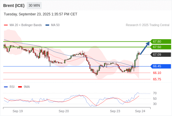 在 66.45 之上,看涨,目标价位为 67.50 ,然后为 67.80 。