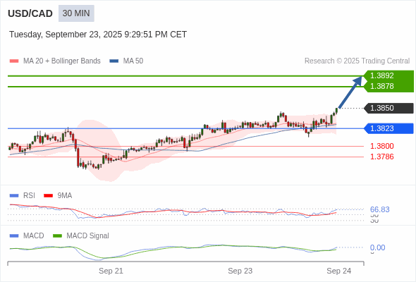 美元/加元 当日内 : 看涨,当 1.3823 为支撑位。