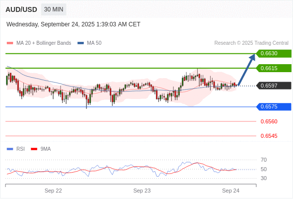 在 0.6575 之上,看涨,目标价位为 0.6615 ,然后为 0.6630 。