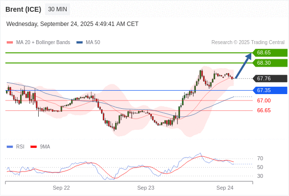 在 67.35 之上,看涨,目标价位为 68.30 ,然后为 68.65 。