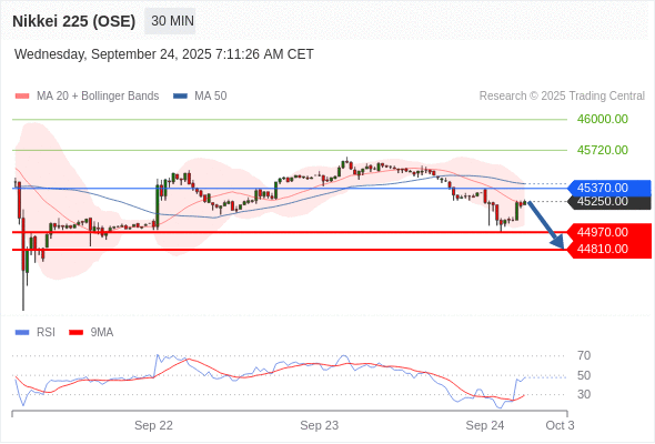 在 45370.00 之下,看跌,目标价位为 44970.00 ,然后为 44810.00 。