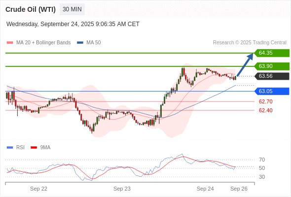 在 63.05 之上,看涨,目标价位为 63.90 ,然后为 64.35 。