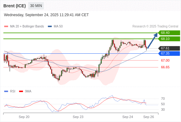 在 67.35 之上,看涨,目标价位为 68.10 ,然后为 68.40 。