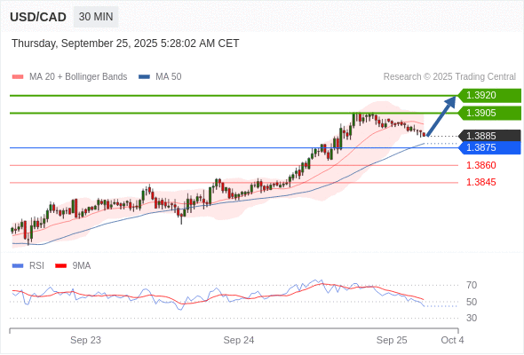 在 1.3875 之上,看涨,目标价位为 1.3905 ,然后为 1.3920 。