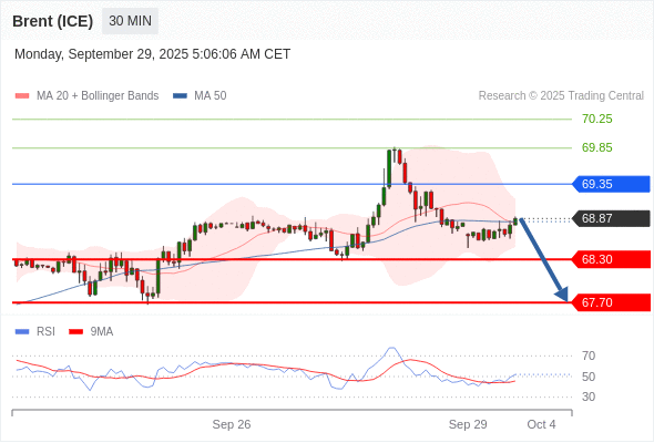 在 69.35 之下,看跌,目标价位为 68.30 ,然后为 67.70 。