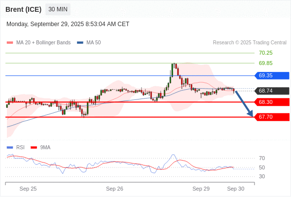 在 69.35 之下,看跌,目标价位为 68.30 ,然后为 67.70 。