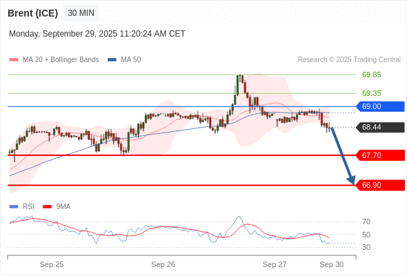 在 69.00 之下,看跌,目标价位为 67.70 ,然后为 66.90 。