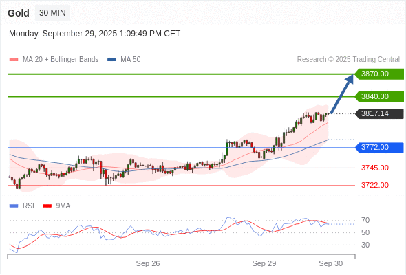 在 3772.00 之上,看涨,目标价位为 3840.00 ,然后为 3870.00 。