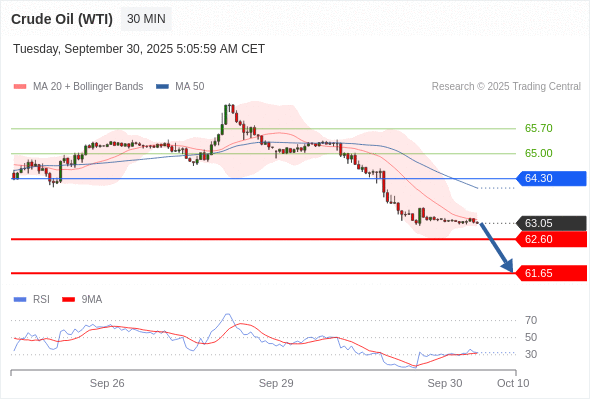 在 64.30 之下,看跌,目标价位为 62.60 ,然后为 61.65 。