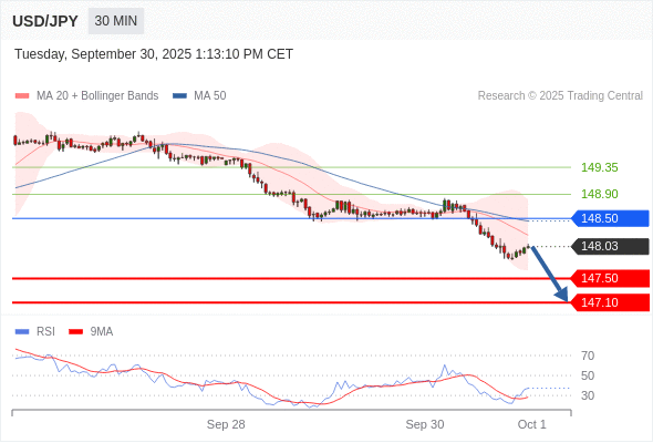 在 148.50 之下,看跌,目标价位为 147.50 ,然后为 147.10 。