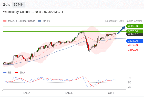 在 3834.00 之上,看涨,目标价位为 3870.00 ,然后为 3890.00 。