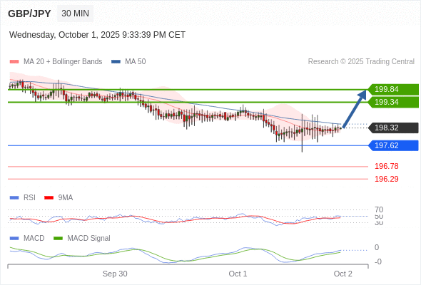 备选策略: 向下跌破 197.62 ,将带来继续下跌的趋势,目标位为 196.78 然后为 196.29 。