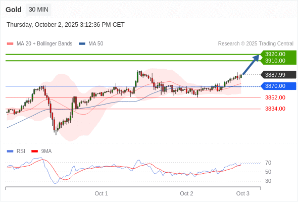 在 3870.00 之上,看涨,目标价位为 3910.00 ,然后为 3920.00 。