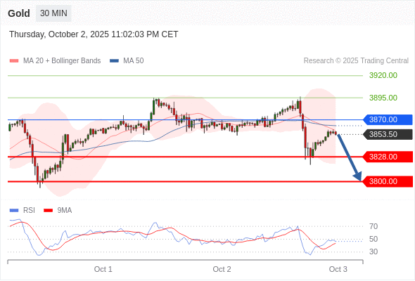 交易策略: 在 3870.00 之下,看跌,目标价位为 3828.00 ,然后为 3800.00 。