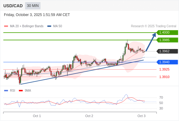 在 1.3940 之上,看涨,目标价位为 1.3985 ,然后为 1.4000 。