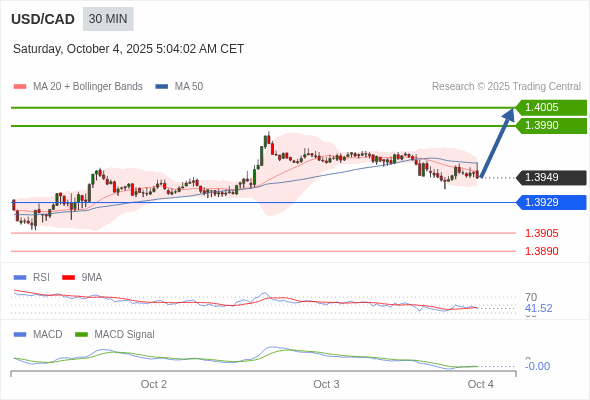 美元/加元 当日内 : 有上涨的可能,目标价位定在 1.4005 。