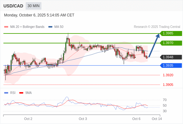 在 1.3935 之上,看涨,目标价位为 1.3970 ,然后为 1.3985 。