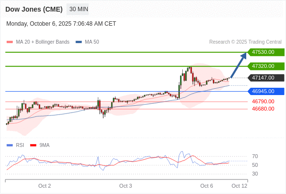 在 46945.00 之上,看涨,目标价位为 47320.00 ,然后为 47530.00 。