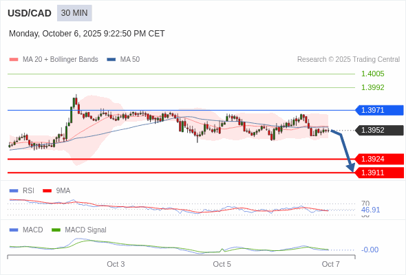 美元/加元 当日内 : 看跌,在 1.3971 之下。