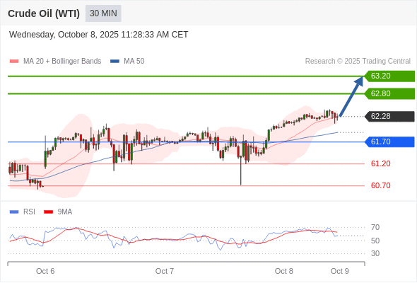 在 61.70 之上,看涨,目标价位为 62.80 ,然后为 63.20 。